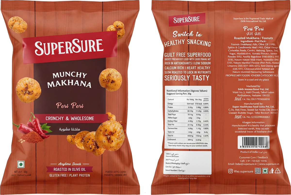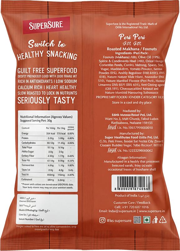 Turn up the heat with SuperSure Munchy Makhana – Peri Peri. Made from premium makhana and slow roasted in olive oil, this crunchy snack is coated with bold peri peri spices for a spicy, tangy kick in every bite. Light yet satisfying, it’s a guilt-free superfood rich in plant protein, low sodium, and packed with wholesome goodness. Perfect for spice lovers, evening cravings, or on-the-go snacking, SuperSure Peri Peri Makhana delivers serious flavor while helping you switch to healthy snacking.